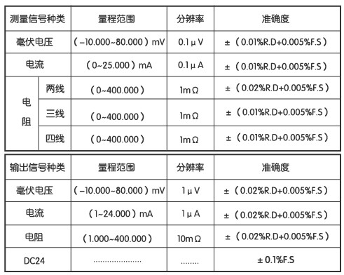 基本应用: 测量输出同时使用。可以测量毫伏电压、电流、电阻、热电偶(三通道测量)、电阻(双通道测量);可以输出毫伏电压、电流、电阻、模拟热电偶、模拟热电阻 支持热电偶型号:S、R、B、K、N、E、J、T 支持热电阻型号:Pt100、Pt10、Cu100、Cu50