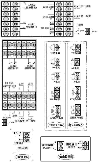 通讯方式RS485,输出方式为继电器输出,PV输入类型为4~20 mA,SV输入类型为4~20 mA,第一报警为下限报警,第二报警为上限报警,DC24V馈电输出,DC24V供电。