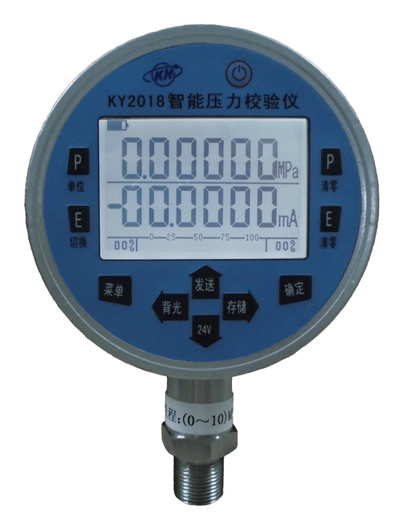 KY2018 智能数字压力校验仪是具有高精度测量压力、电流、电压,同时可以测量开关量、环境温度及DC24V电源输出功能。附加功能有:压力检漏、压力开关的触动时压力值的记忆、测量数据的存储与提取等。供电方式采用可充电锂电池组,一次充电可连续工作100小时以上。方便用于校验精密压力表、一般压力表、压力变送器、压力传感器、压力开关、血压计、等压力仪器仪表。
