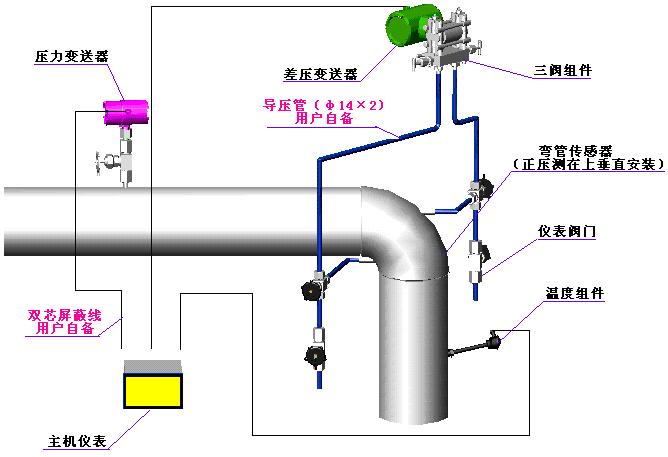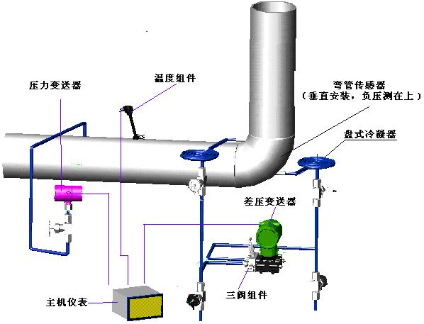 弯管流量计的一次传感元件——弯管传感器依安装管线上的不同分为如下三种: