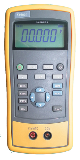 KY6002 热电偶校验仪是一个由内置超大容量锂电池供电的,测量和输出热电偶,毫伏信呈的手持便携式仪器。具有LED背光源,以便在光线暗淡的场所使用。精度高使用方便,是现场检修必备的产品。