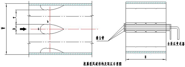 根据流体力学原理,风道内气流流经机翼测量装置时,在机翼表面产生绕流,并在a点与b点产生压力差,a点的压力为全压,b点的压力由于该处通流截面收缩,静压下降,因此a点与b点之间有差压,该压差与气流流速或流量Qv之间呈一定的函数关系。