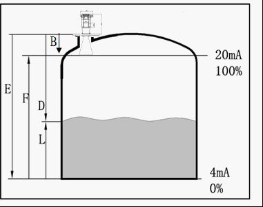 B盲区F:最大量程 E:满仓 D:空高 L:物料高度