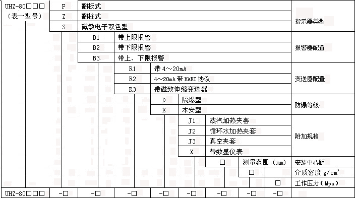 适用范围: UHZ-80C16/16A耐腐磁性液位计适用于腐蚀性介质且工作温度又较高场合的液位测量,由于采用的是不锈钢内衬四氟乙烯,可靠性高。 类型有:有盲区测量和无盲区测量二种。