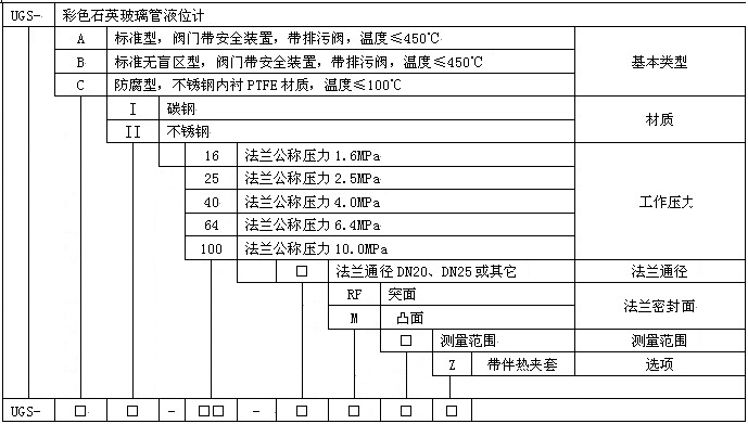 概述 UGS系列彩色石英玻璃管液位计是采用高纯度石英管(99.99%SiO2)生产制造的现场显示液位计,该仪表显示清晰,密封性能好,耐高温、高压、防粘稠,寿命长、冲洗、维护方便,广泛用于石油、化工、电力、冶金等行业中各种容器及锅炉的液位指示。